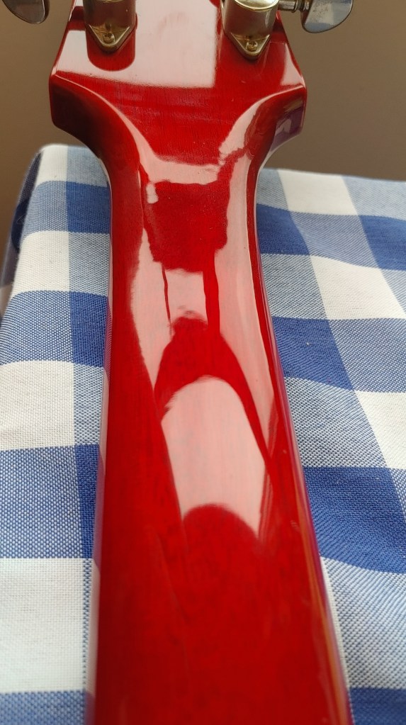 When you’ve made your second pass and cleaned it up, you’ll have something like this. I’ve left the sanding ragged at the base of the headstock to demonstrate how the 1000-grit sandpaper changes up the gloss to matte.