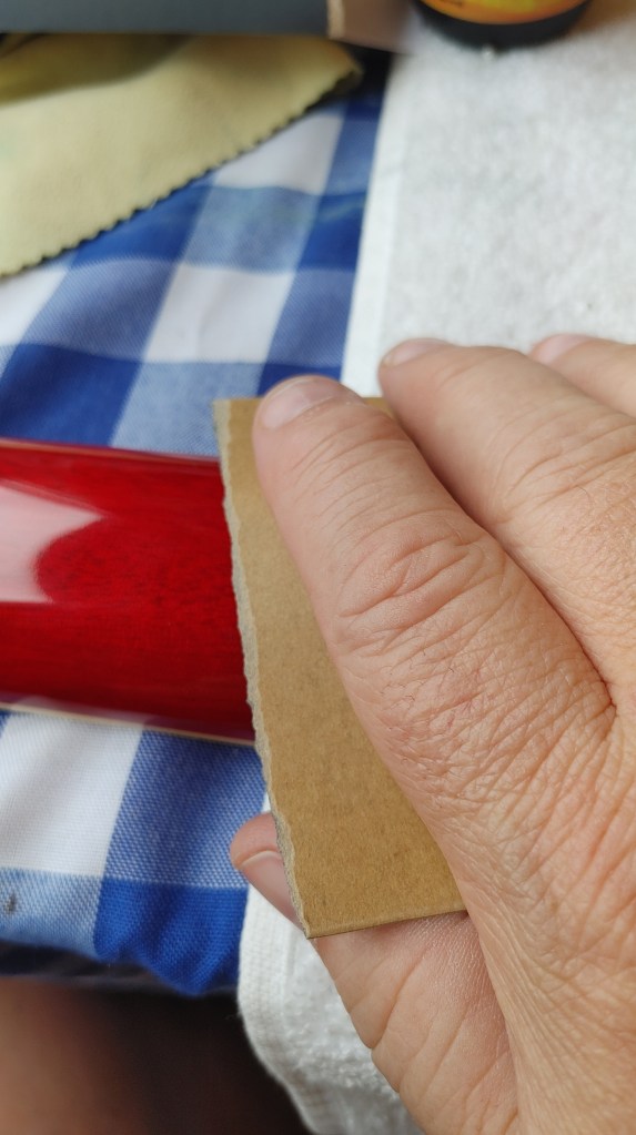 I’ll tear my sandpaper into three pieces, roughly 3 inches square. Usually, I’ll use two of these squares, one for removing the majority of the high gloss and the second for touch-ups after cleaning the first pass.