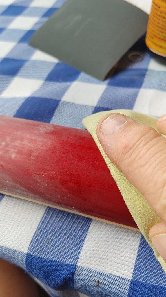 This is where your second piece of sandpaper comes in. You’re going to repeat the sanding process, but only on those areas that still retain full gloss, or to extend your treatment. This is the stage where I usually fine-tune sanding around the headstock and heel.